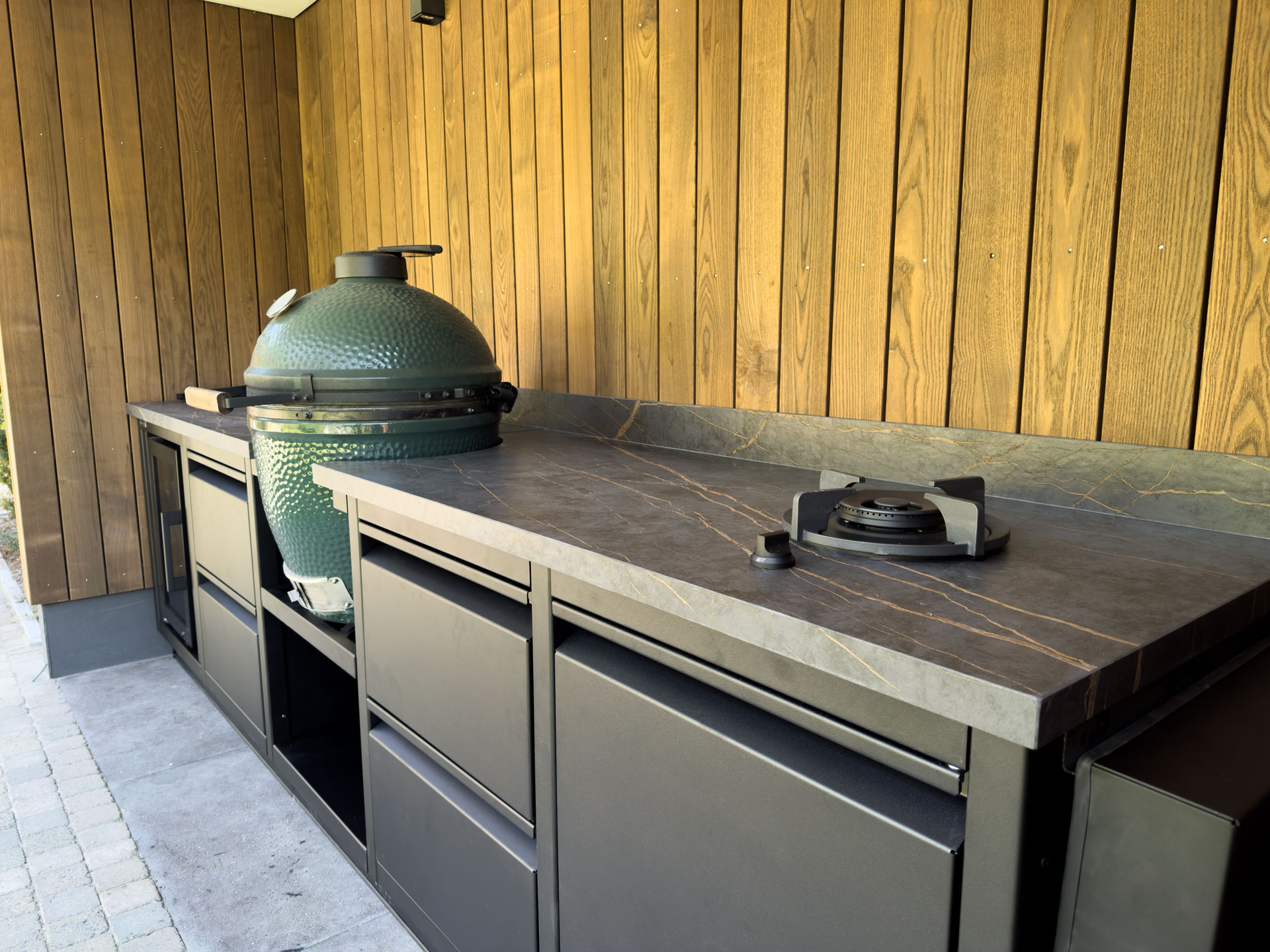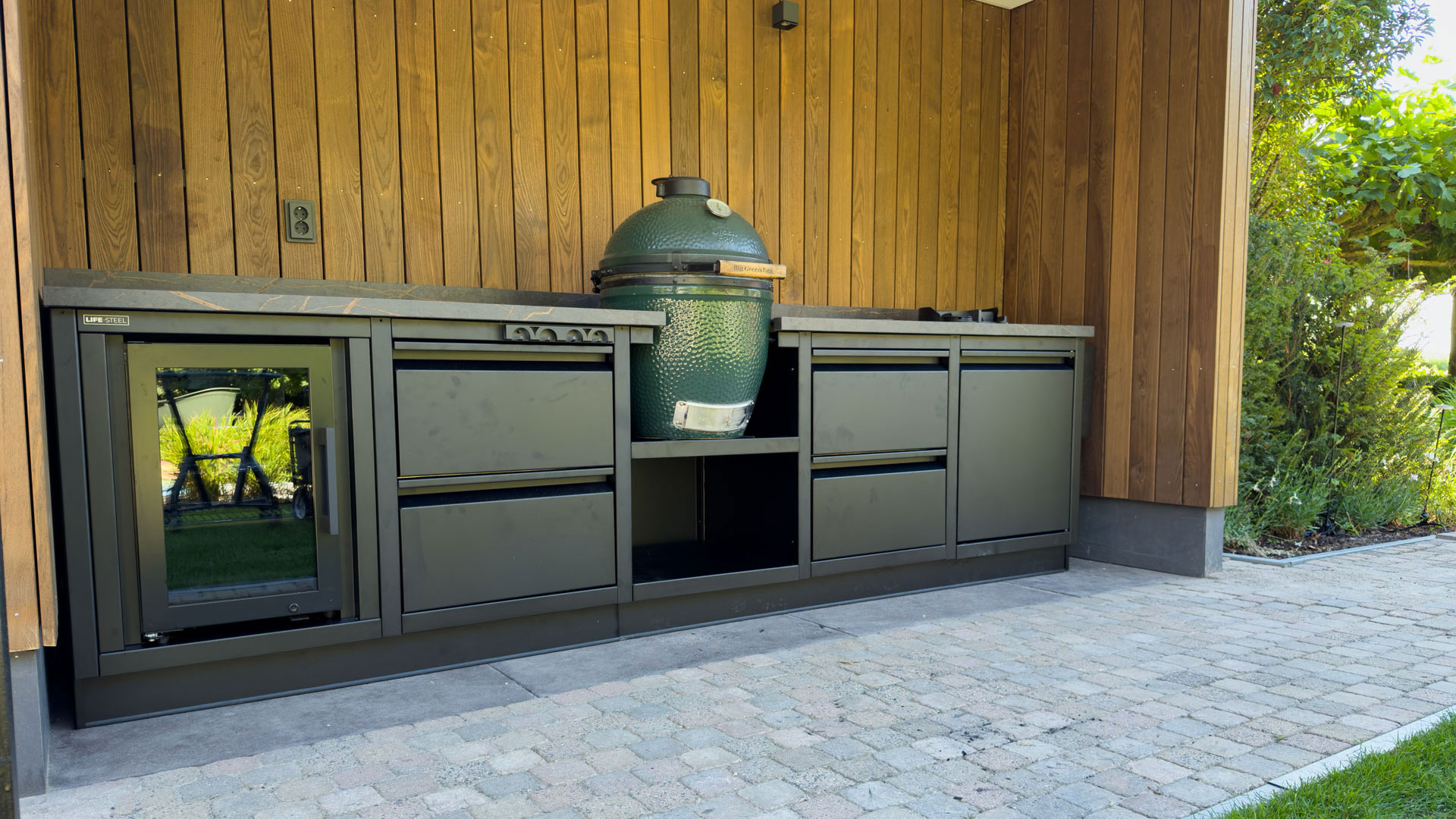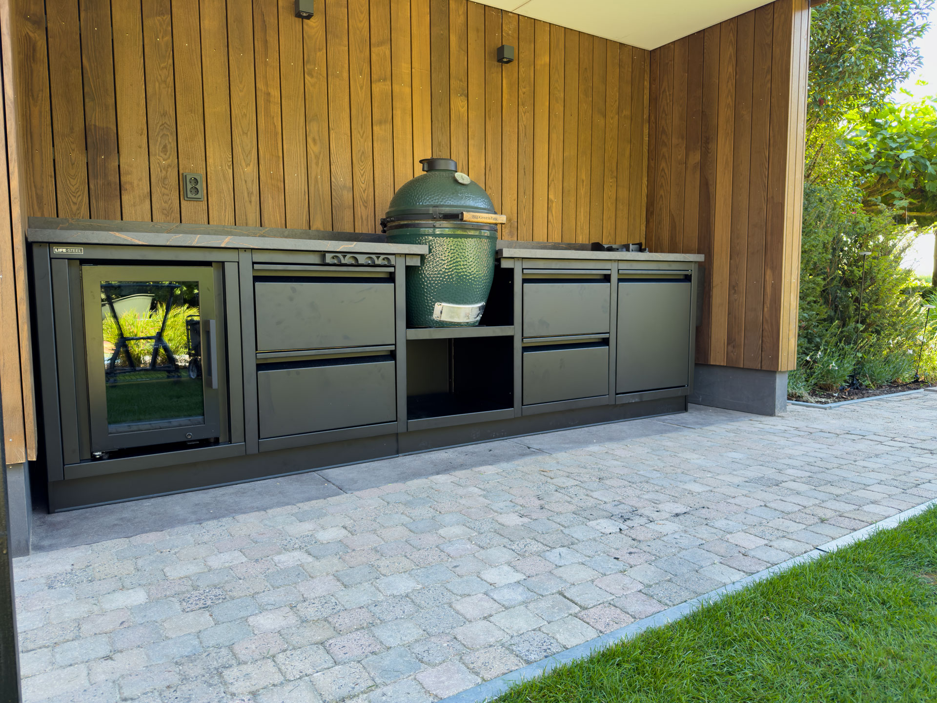 We had the pleasure of installing this outdoor kitchen for a true barbecue enthusiast. Centered in the kitchen is the Big Green Egg, the eye-catcher of this kitchen. Double drawers to the left and right of the Big Green Egg provide ample storage space for all grids, heat shields and other accessories. In addition, the drawers have an inner drawer for tools such as barbecue tongs, lighters and other small tools.