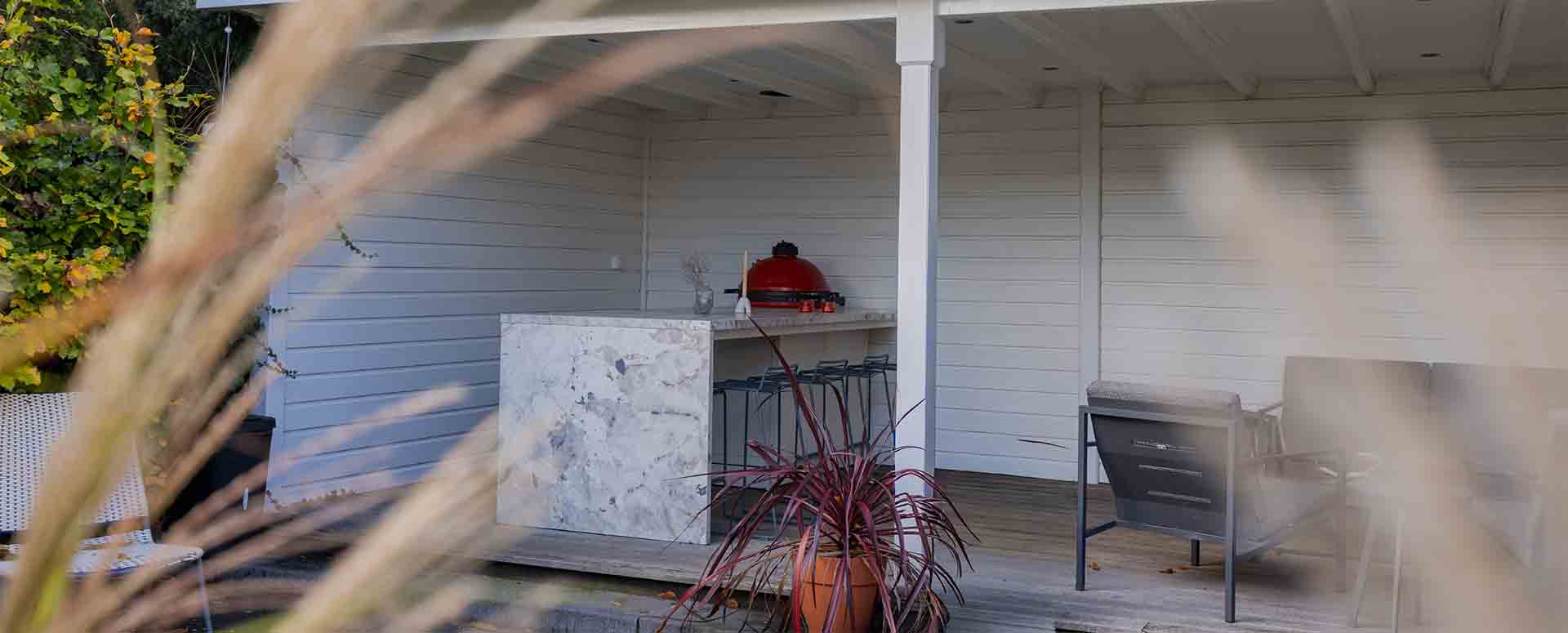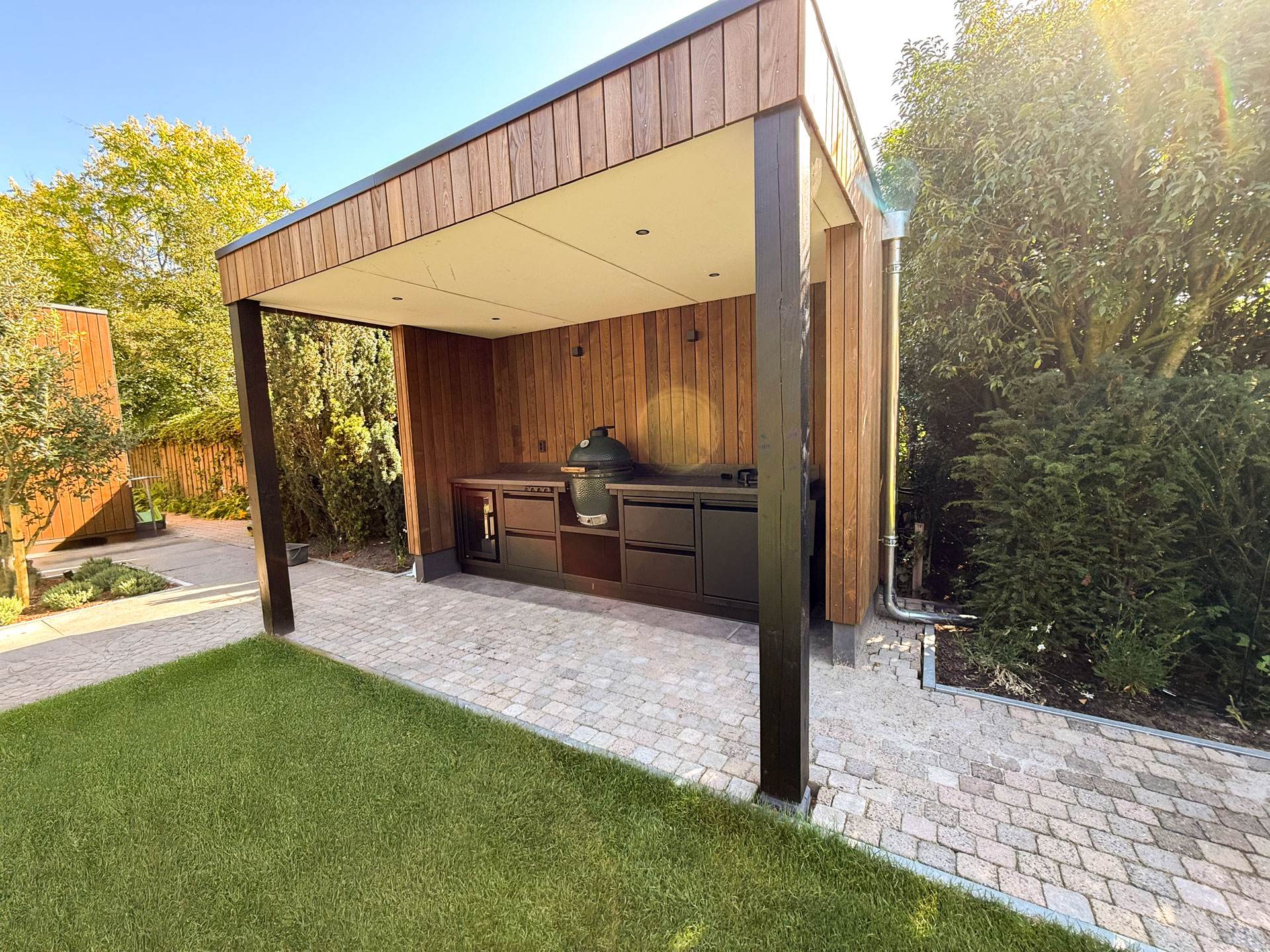 A luxury outdoor kitchen under a custom-made canopy. This means you are always dry while barbecuing and can always enjoy a delicious meal. Regardless of the weather.